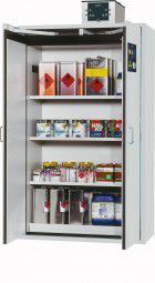 Für die sichere Lagerung von Gefahrstoffen in Arbeitsräumen gemäß DIN 14470-1 und TRGS 510, in 3 Breiten (600/900/1200 mm), mit serienmäßiger Türfeststellanlage.