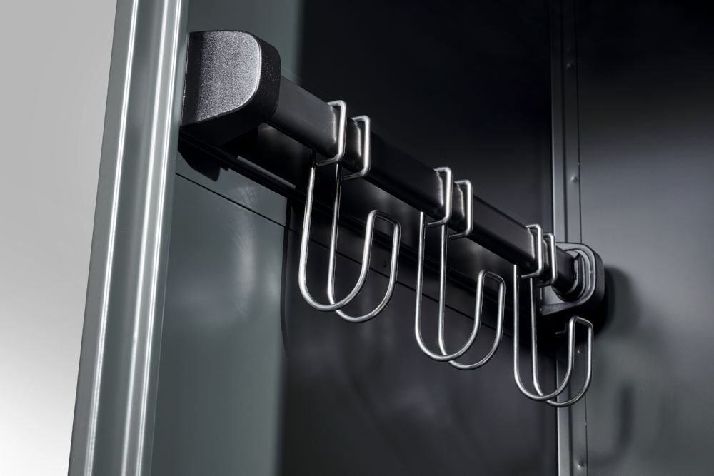 - 2 seitliche Multifunktions-Hakenleisten mit je 3 verschiebbaren