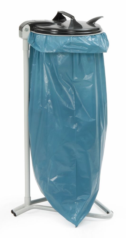 In Stahlrohrkonstruktion, pulverbeschichtet, lichtgrau RAL 7035. PVC-Deckel und Klemmring, Öffnungs-Ø 340 mm. Für 120 Liter Säcke. 2 Standfüße und 2 Vollgummiräder 150 mm Ø