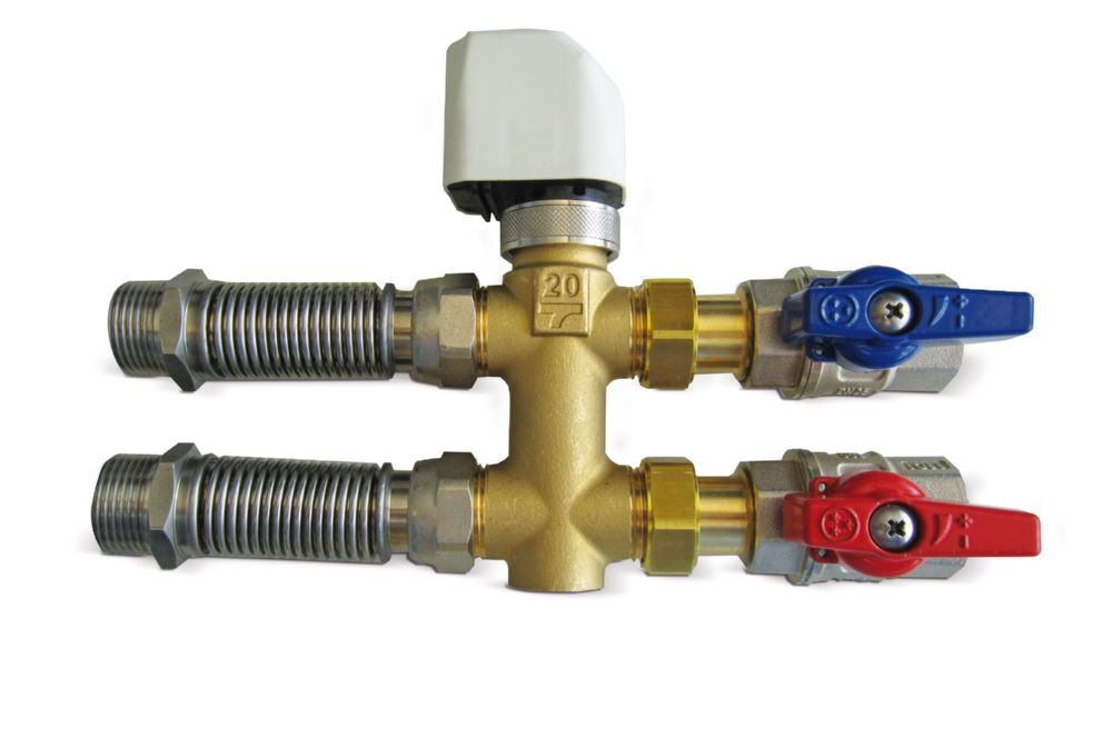 Installationsfertige Ventilbaugruppen mit flexiblen Edelstahlwellrohren und Absperrventilen für Vor- und Rücklauf zum direkten Anschluss an den Wärmetauscher des Gerätes. Dreiwege-Ventilkörper mit vier Anschlüssen und mit thermisch betätigtem Ventilkopf ermöglicht eine Leistungsregelung bei kontinuierlichem Mediumvolumenstrom.