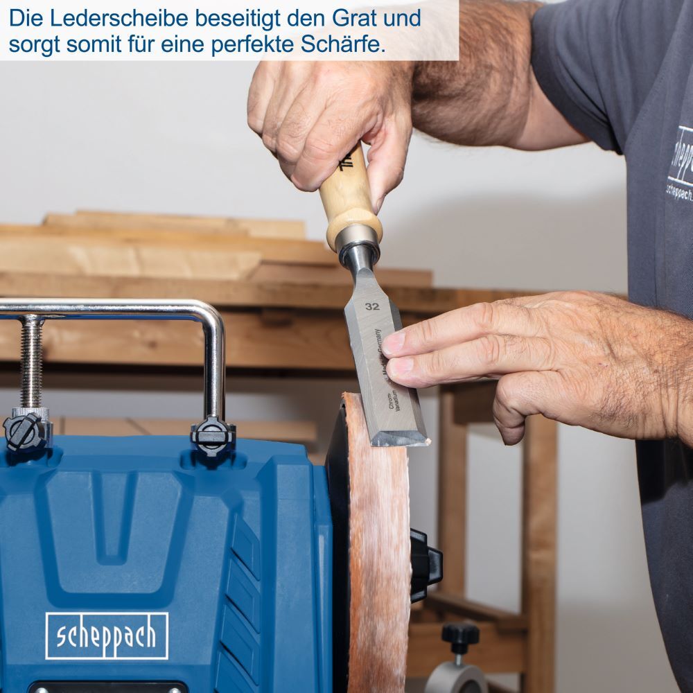 - Abnehmbare Lederabziehscheibe zur Beseitigung von Schleifgraten nach dem Schärfen